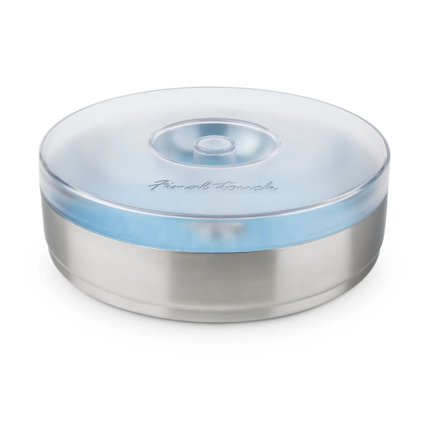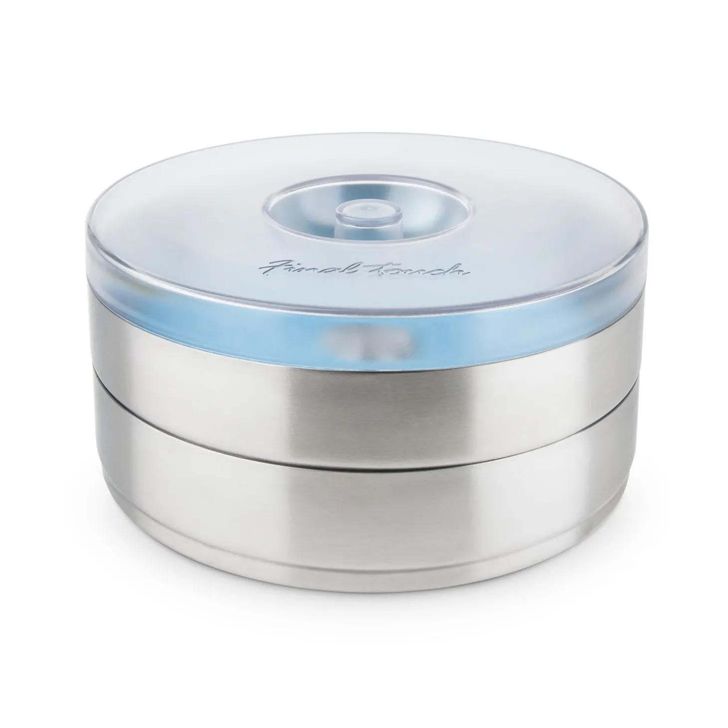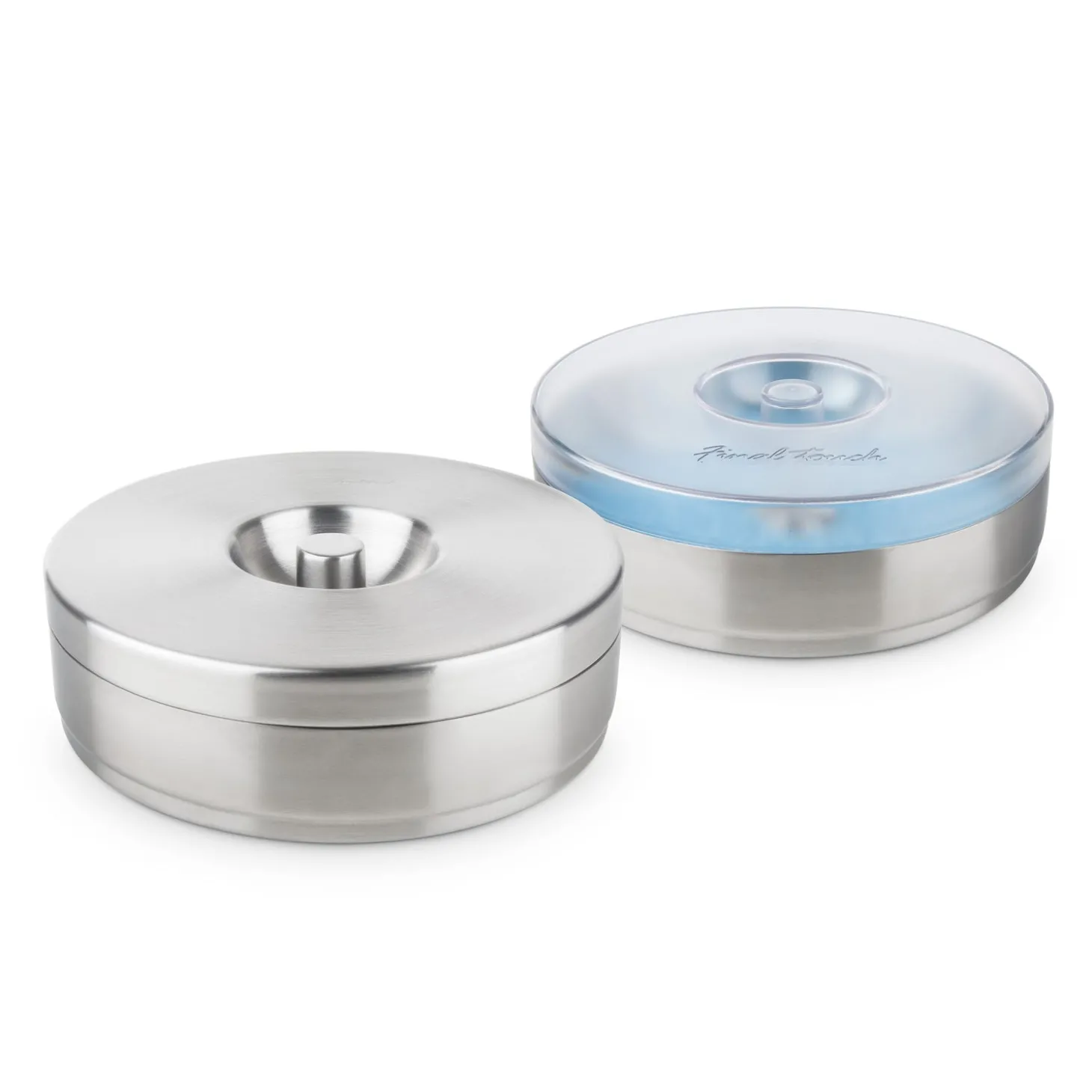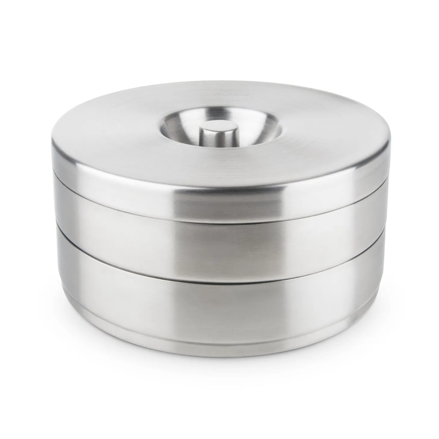 This essential tool for any bar makes rimming glasses quick and easy. Simply fill each of the trays with salt or sugar, moisten the glass rim and dip the glass for the perfect margarita or martini. Each tier tray is constructed from durable commercial grade stainless steel with a large 5.9″ (15cm) diameter. This set includes two lids which allows each tray to be divided.”
