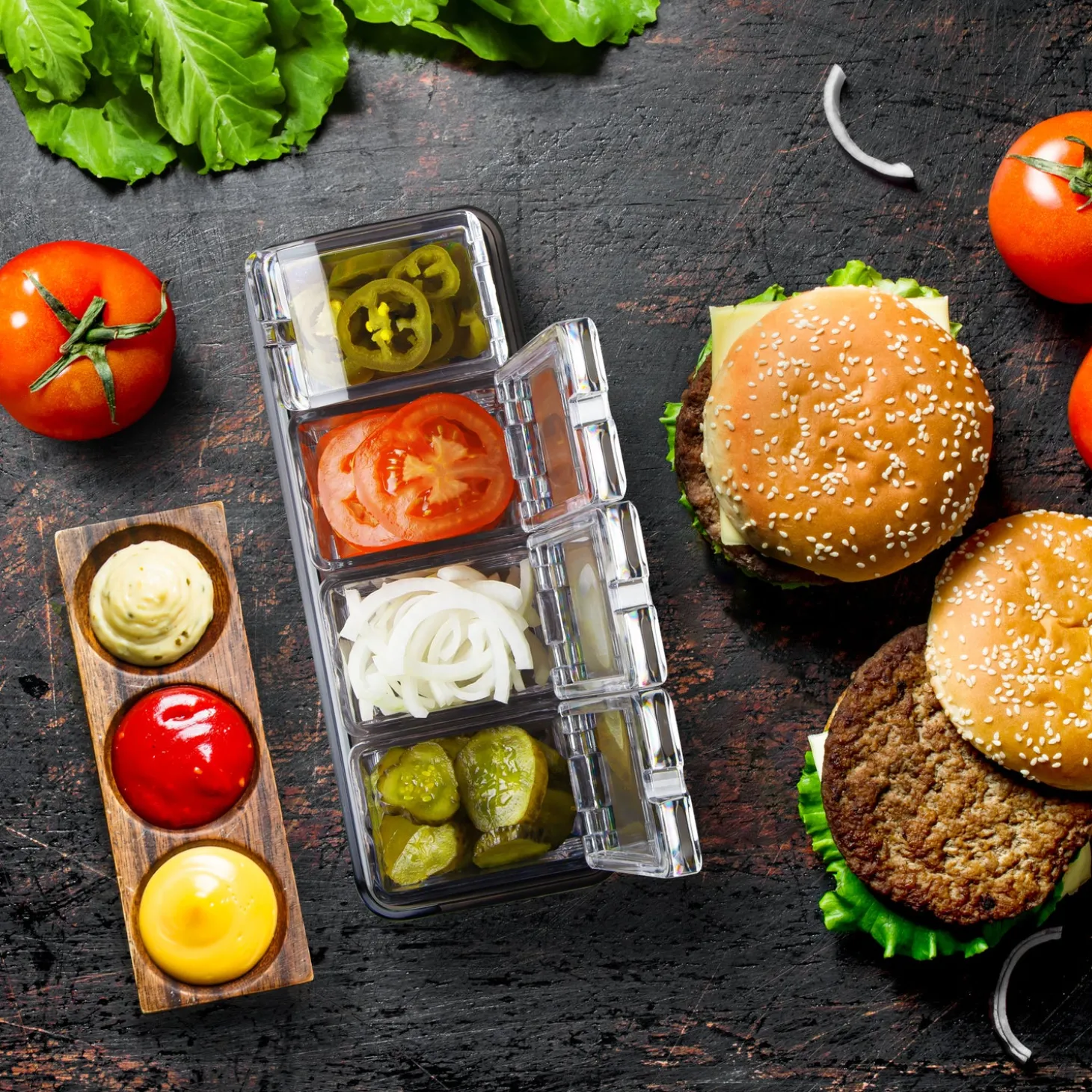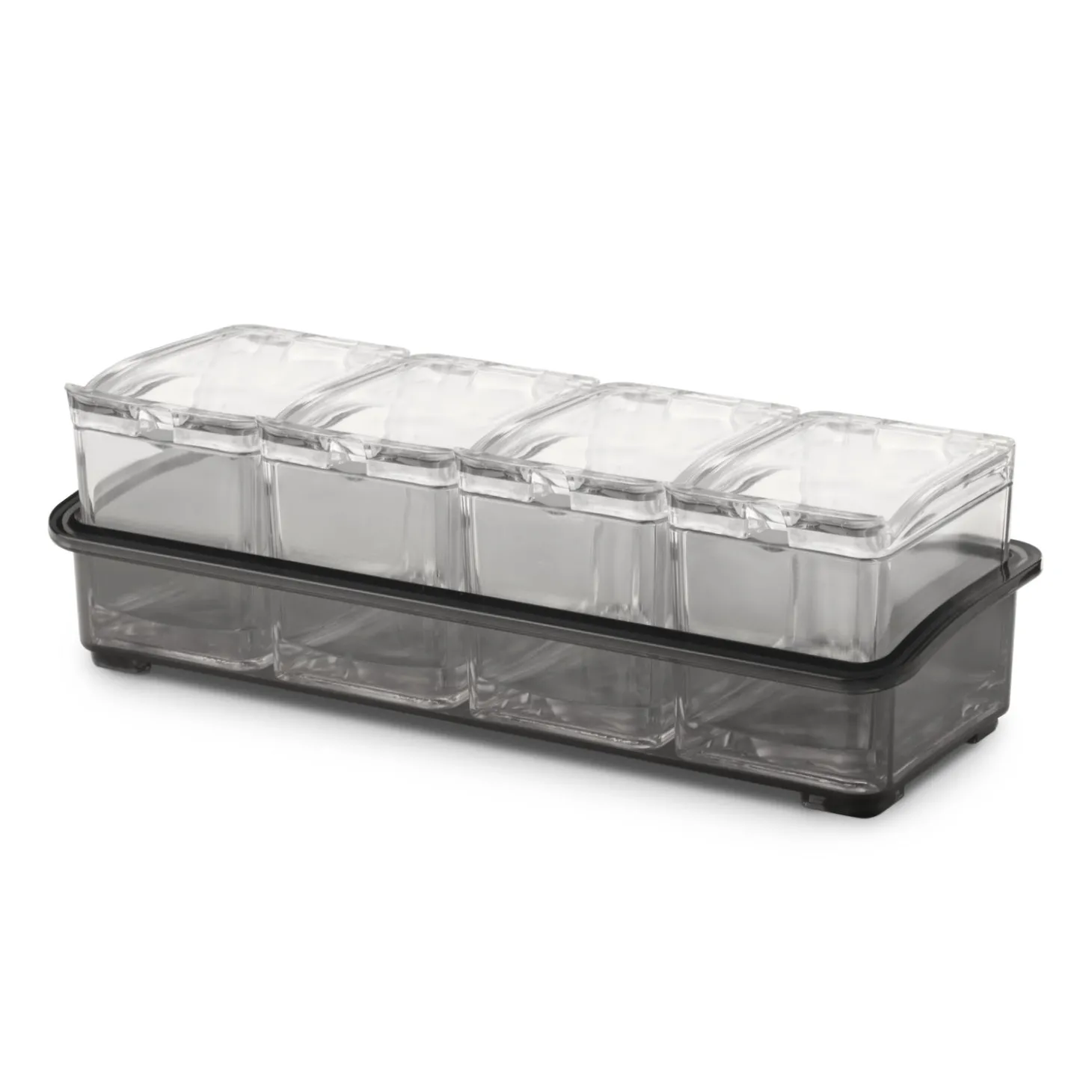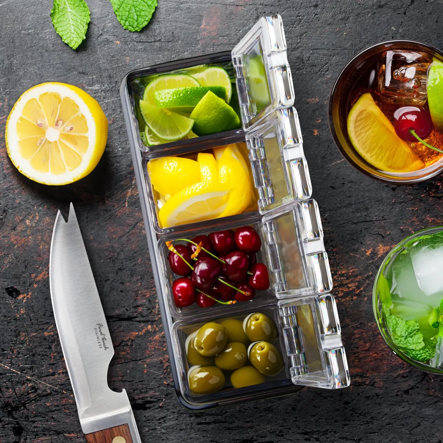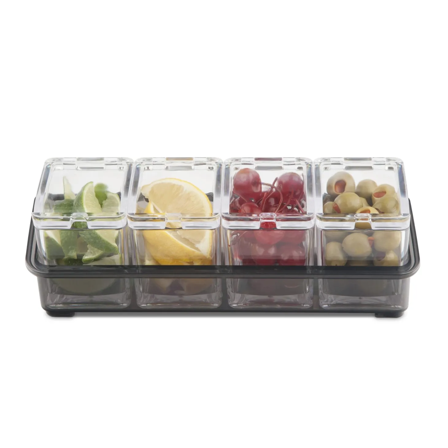 Keep your garnishes for crafty cocktails organized and sanitary with this four tray garnish bar caddy. Each container holds up to 6¾ oz (200 ml) of cherries, olives, lemons or limes and the built-in lids on each container help keep everything fresh and clean. Simply remove each container from the base for easy cleaning when finished.