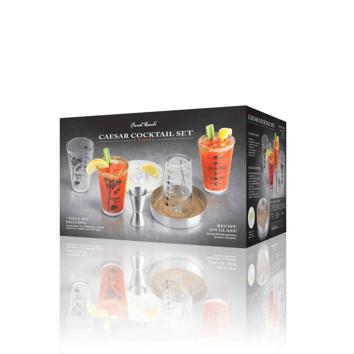 Glasses: Caesar graphic on front of the glass with complete Caesar recipe on back. Made of thick glass – 15 oz (450ml) capacity each.