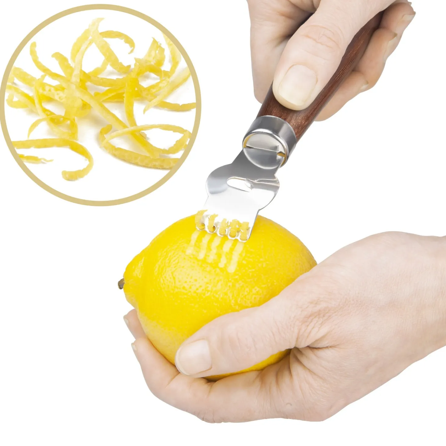 Zester included for creating citrus zest or peel garnishes for cocktails.