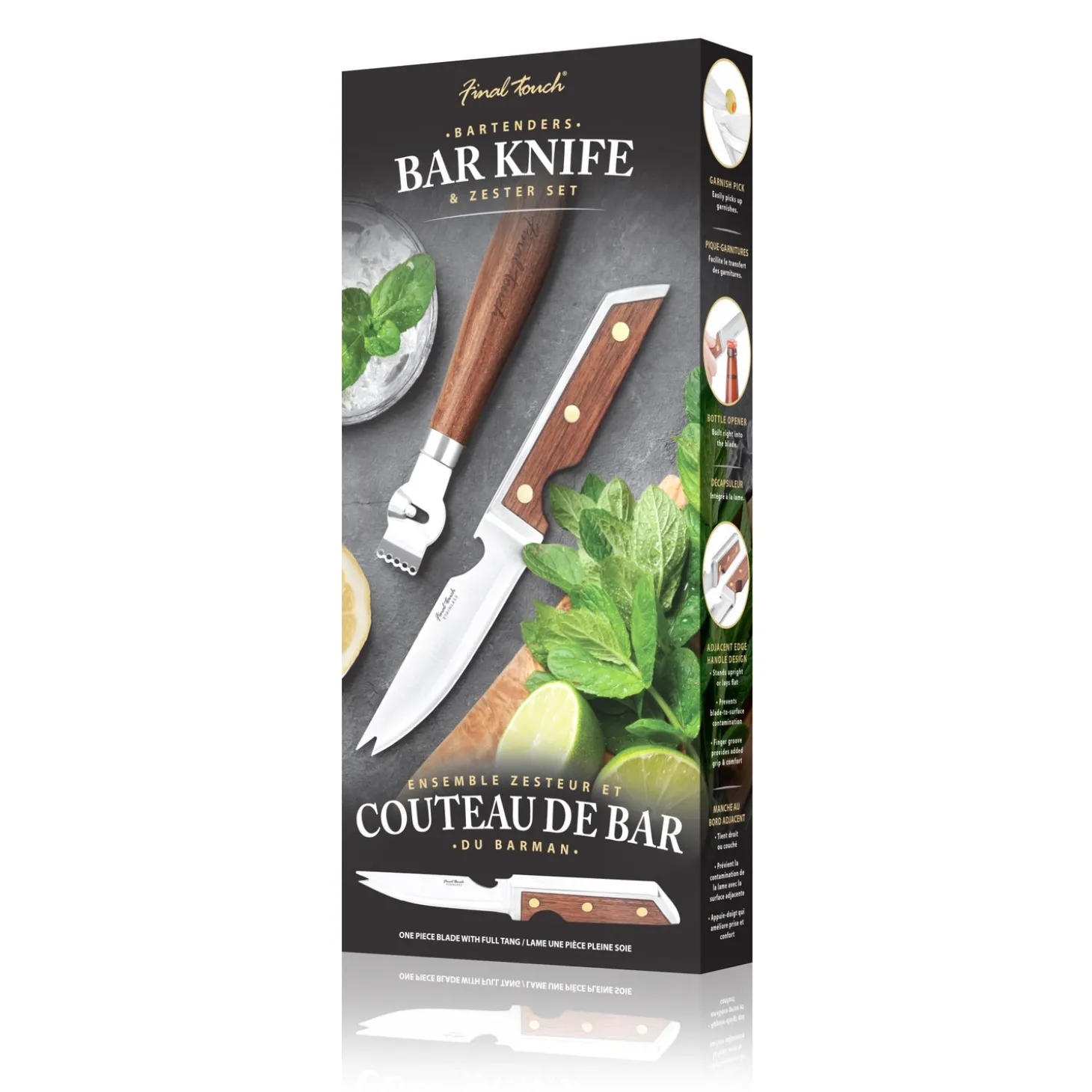 Designed to make cocktail prep quick and easy, this multi-function bar knife and zester set is a must have for any bar enthusiast. Cut, slice and peel garnishes with ease while having the extra ability to pick up garnishes and open bottles with the forked tip and bottle opener in blade. The adjacent edge handle design allows this knife to stand upright or lay flat while preventing blade-to-surface contact.