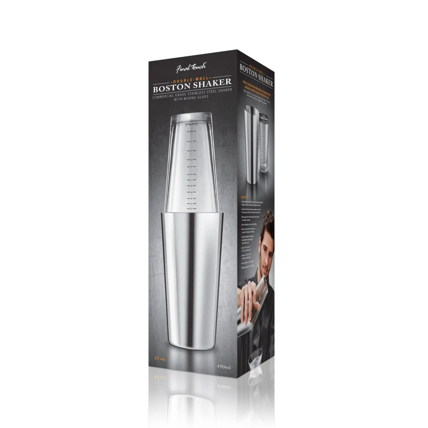 Featuring double-wall construction to prevent condensation from forming on outside of the stainless steel shaker and making it more comfortable to handle while mixing ice cold drinks.