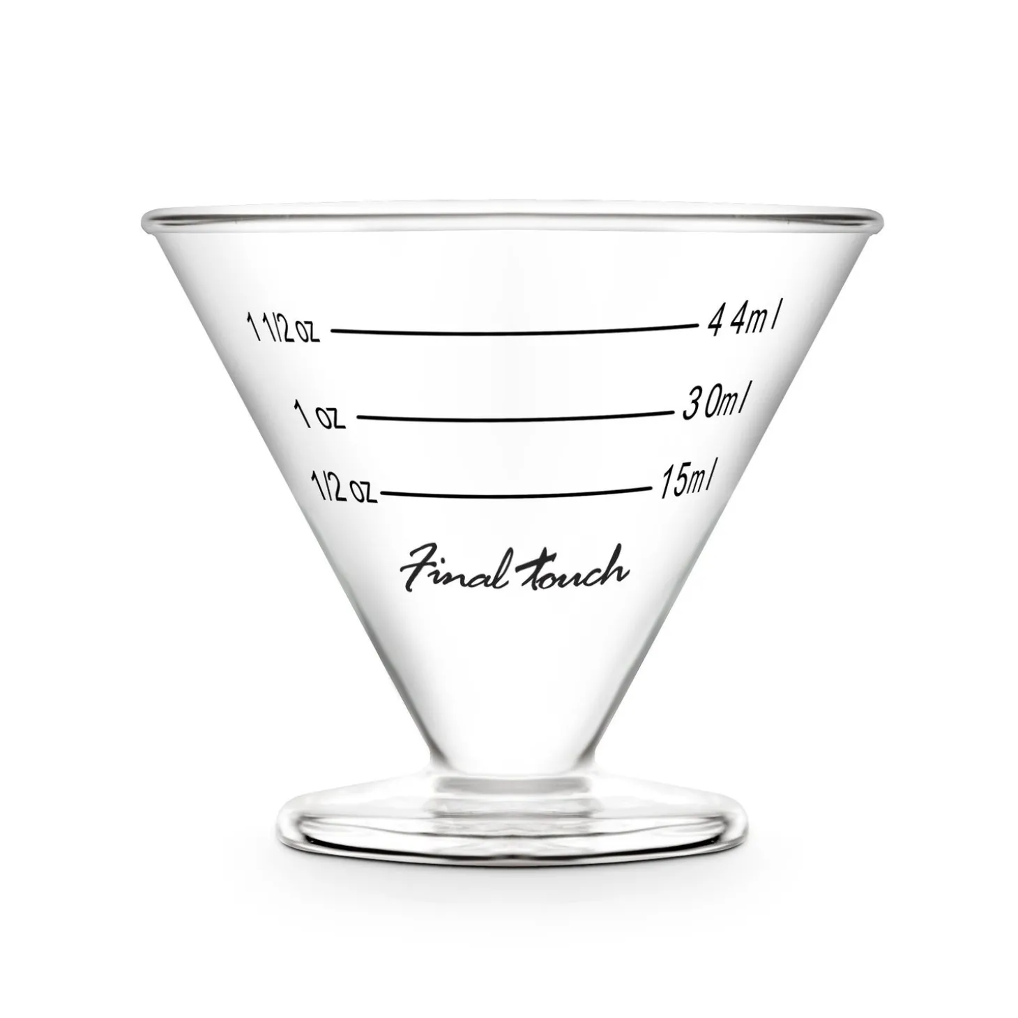 Use this martini shaped measuring glass to evenly mix the perfect cocktail every time! Indicator lines are imprinted right into the glass in ml & oz providing a clear view for easy measuring & pouring. Also can be used as martini tasting glass or shot glass.• Indicator lines in ml & oz• Martini blown glass shape• Also use as martini tasting glass or shot glass• Clear view for easy measuring & pouring”