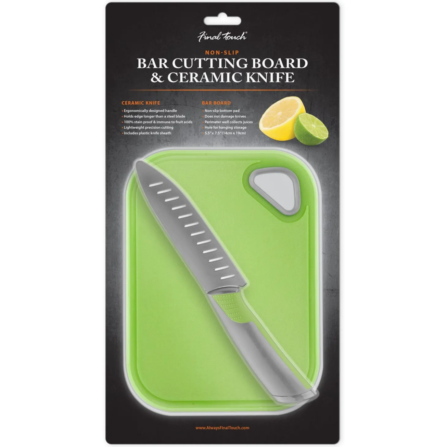 Use this conveniently sized cutting board in the bar or kitchen for cutting up smaller items like garnishes for cocktails. Each board features a non-slip bottom pad to help minimize slipping accidents while cutting. The surrounding perimeter well collects juices and hole in corner provides hanging storage. The included ceramic knife is 100% stain proof & immune to fruit acids from lemons and limes. Easily slice through garnishes with a blade that will hold its edge longer than a steel blade. Made with an ergonomically designed handle and a overall lightweight feel for precision cutting. Includes plastic knife sheath to help keep the ceramic blade protected when not in use.• Ergonomically designed handle • Holds edge longer than a steel blade• 100% stain proof & immune to fruit acids• Lightweight precision cutting• Includes plastic knife sheath”