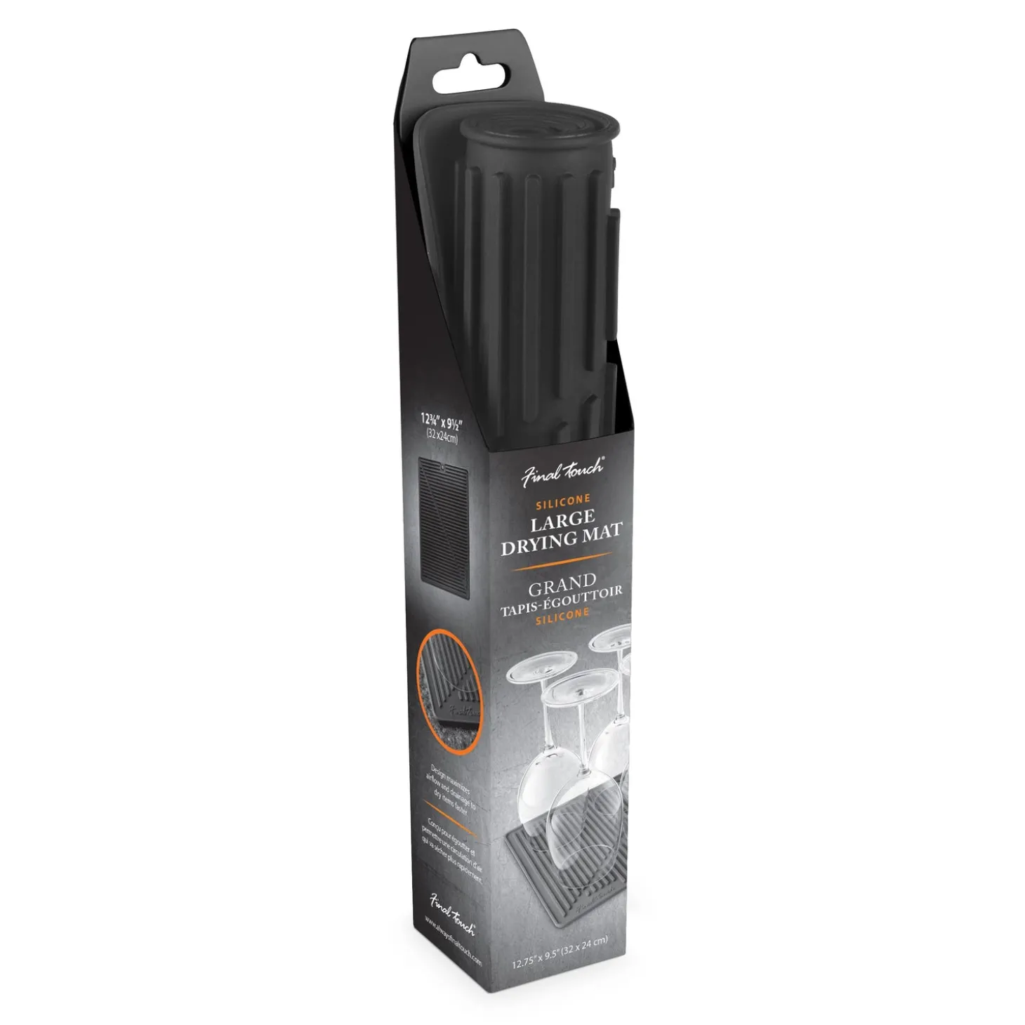 Designed to maximize airflow and drainage this silicone drying mat is large enough for 6-8 red wine glasses or 8 to 12 white wine glasses. The soft silicone material is non-slip, protecting delicate stemware and other barware items. Easily rolls up for storage and can also be used as a trivet; heat resistant up to 425°F (220°C).