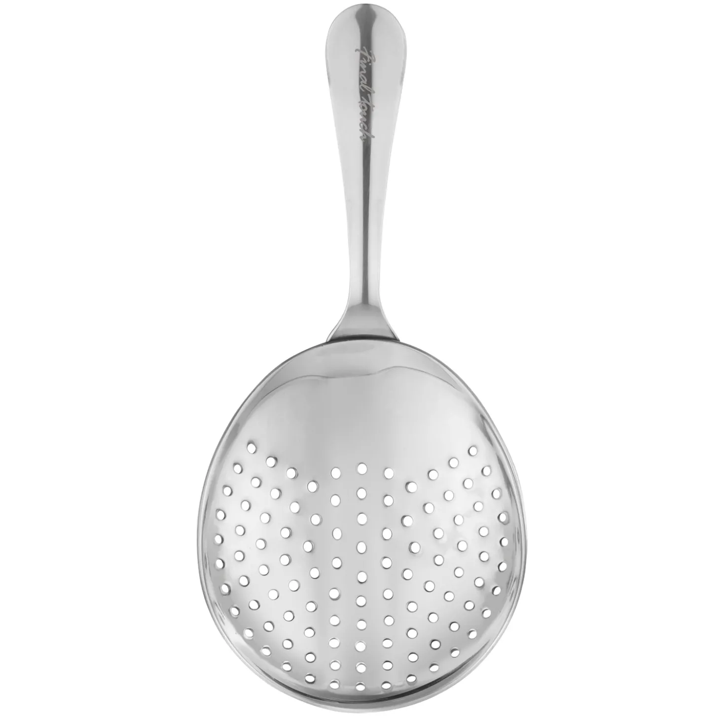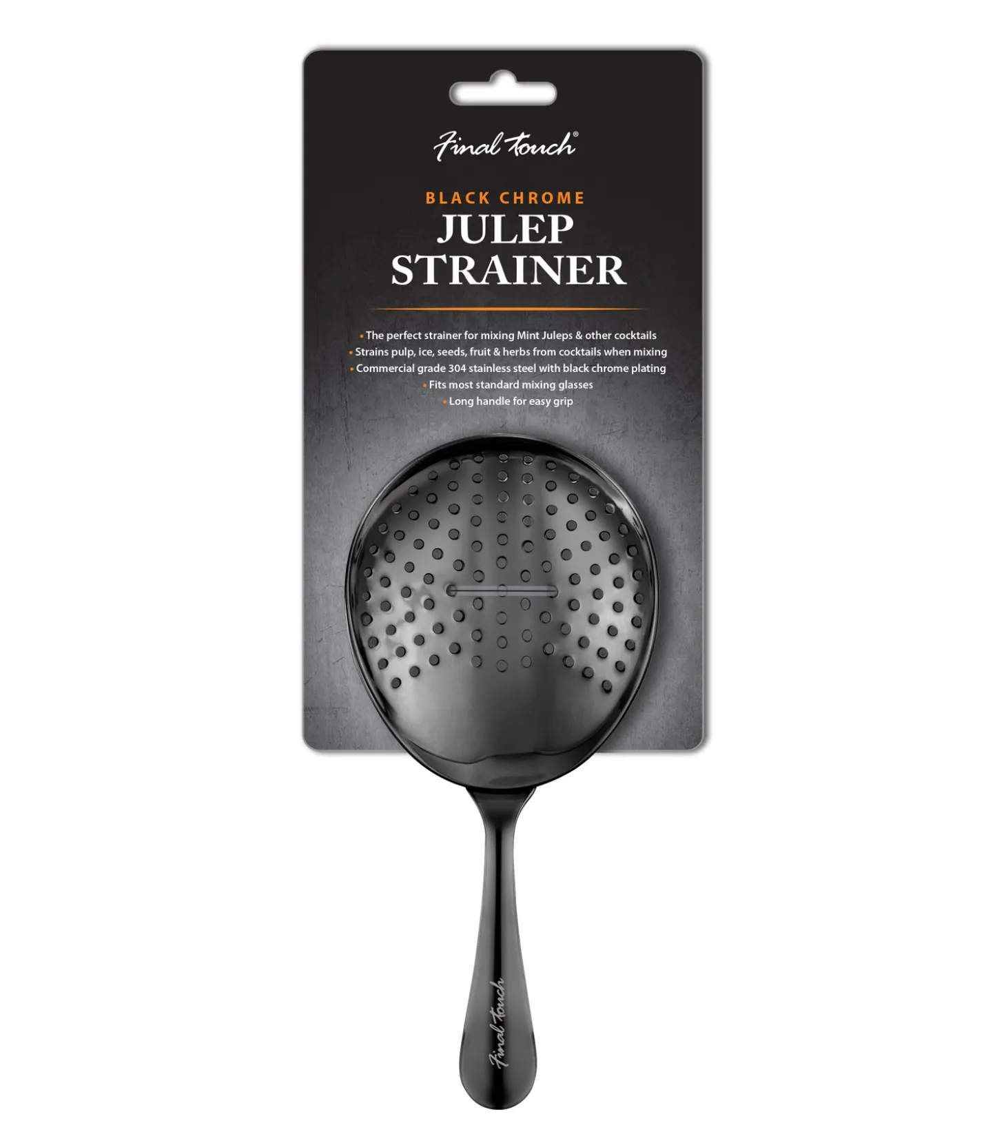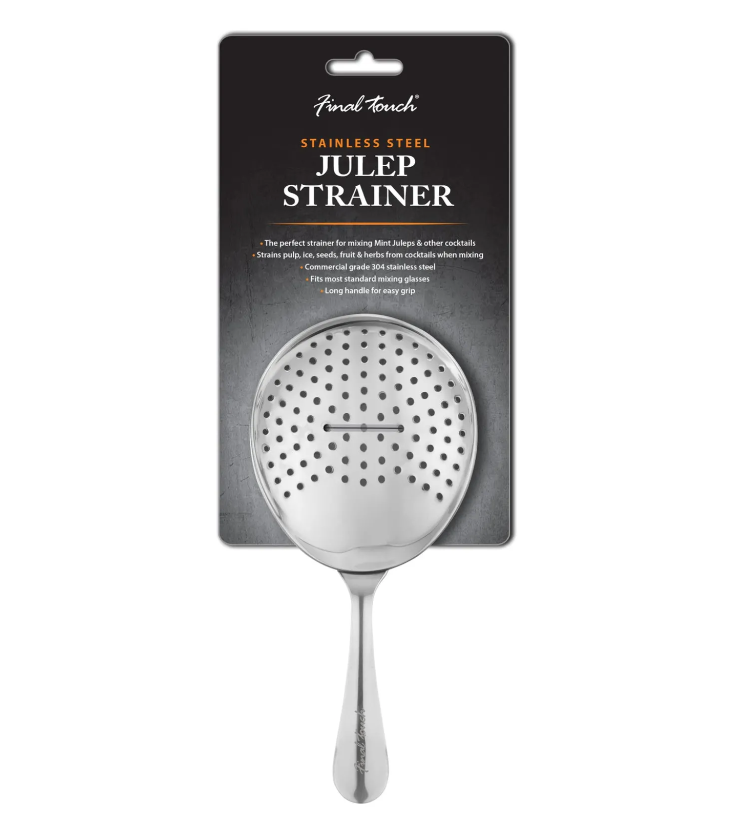 The perfect strainer for mixing Mint Juleps and other cocktails, Final Touch’s bartending tool easily and efficiently strains pulp, ice, seeds, fruit and herbs from cocktails. It’s designed with a long handle for an easy grip. Fits most standard mixing glasses.