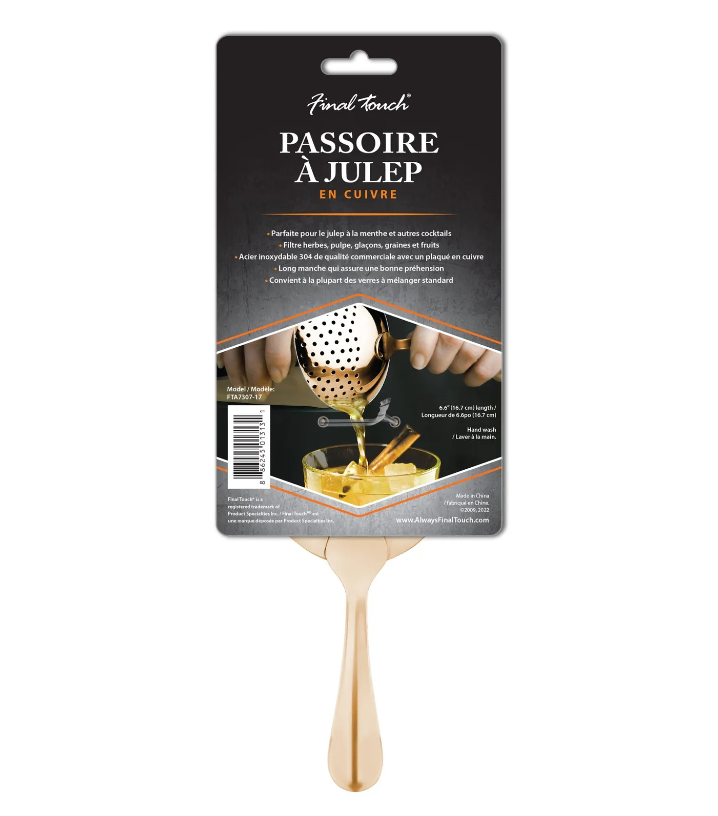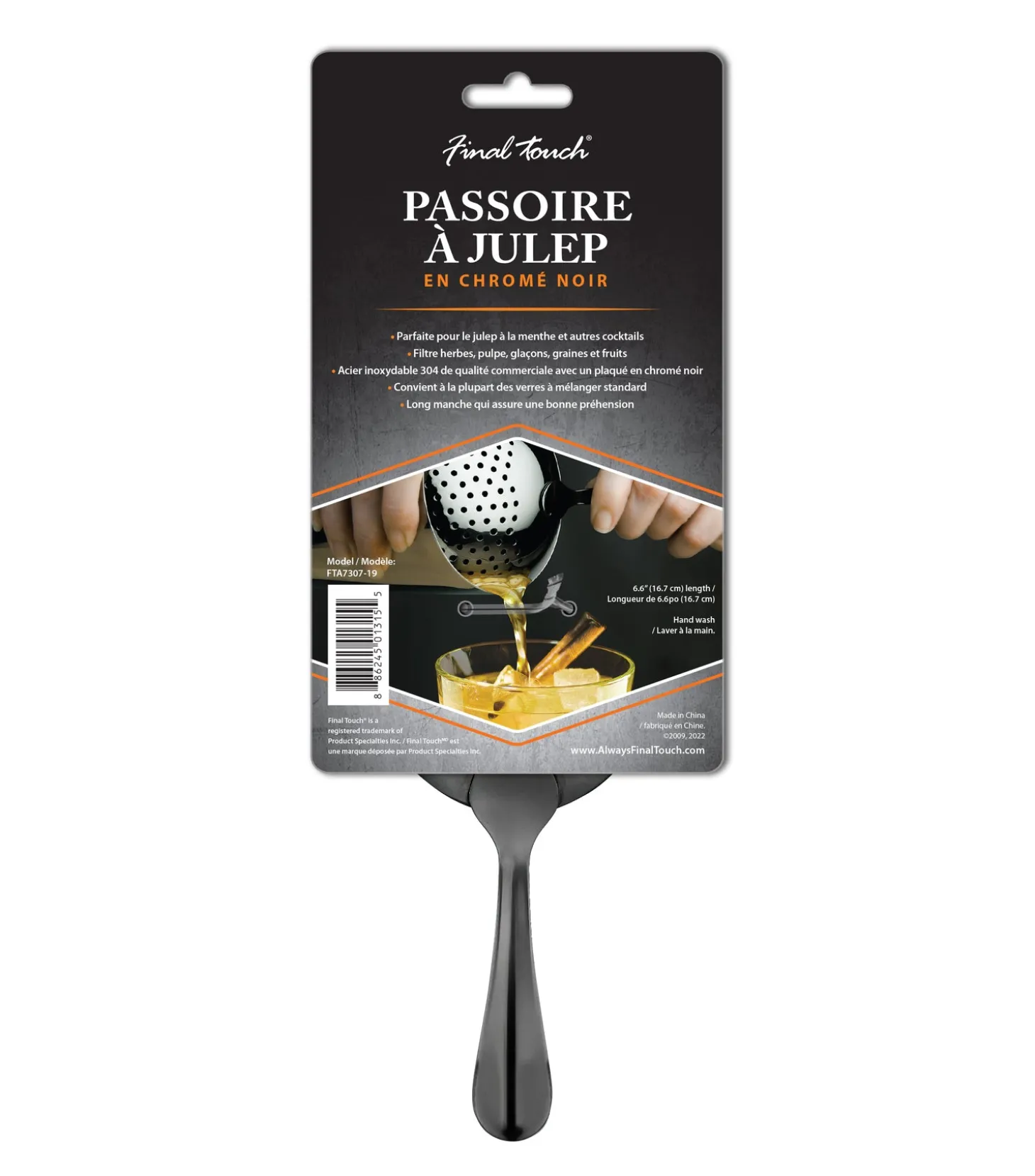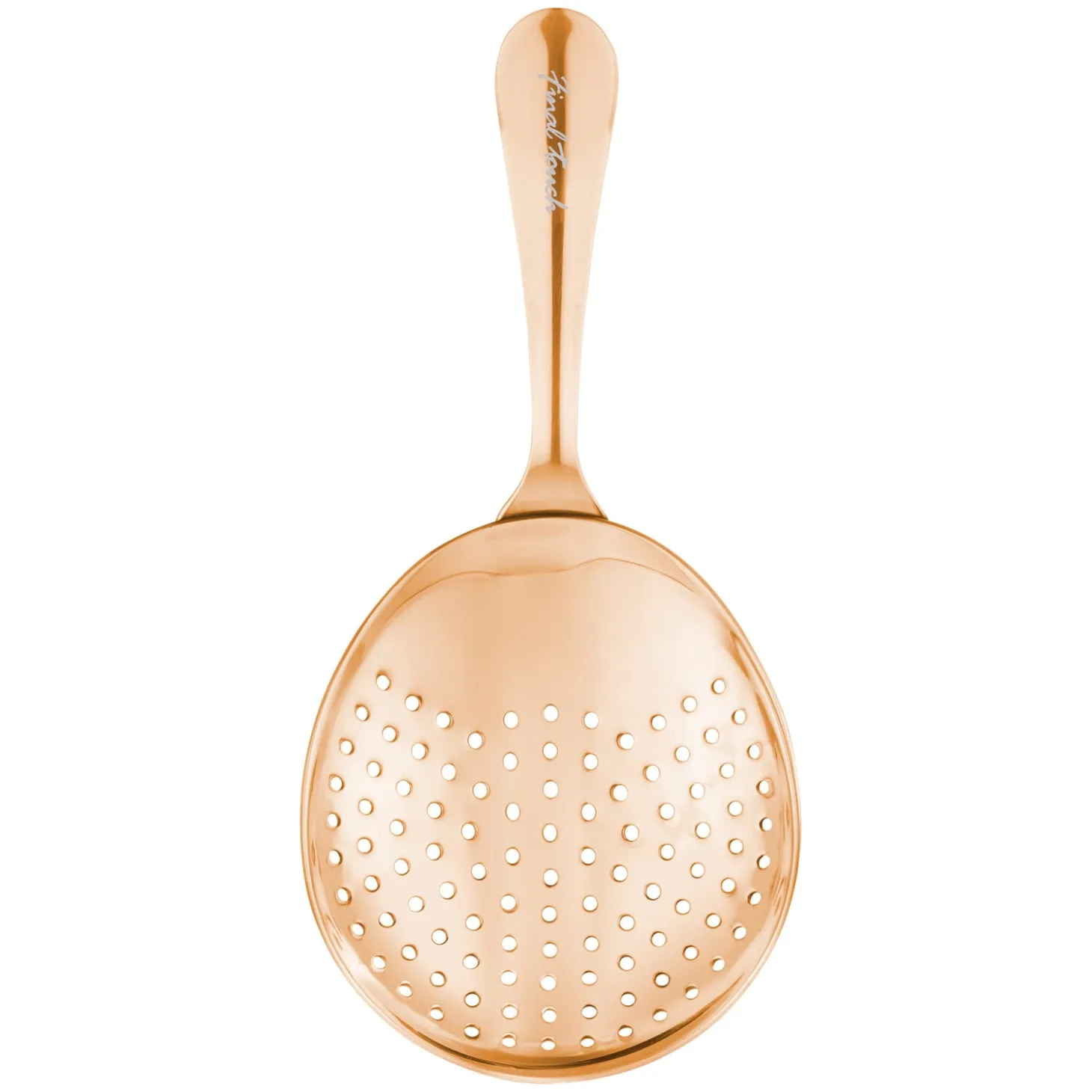 The perfect strainer for mixing Mint Juleps and other cocktails, Final Touch’s bartending tool easily and efficiently strains pulp, ice, seeds, fruit and herbs from cocktails. It’s designed with a long handle for an easy grip. Fits most standard mixing glasses.