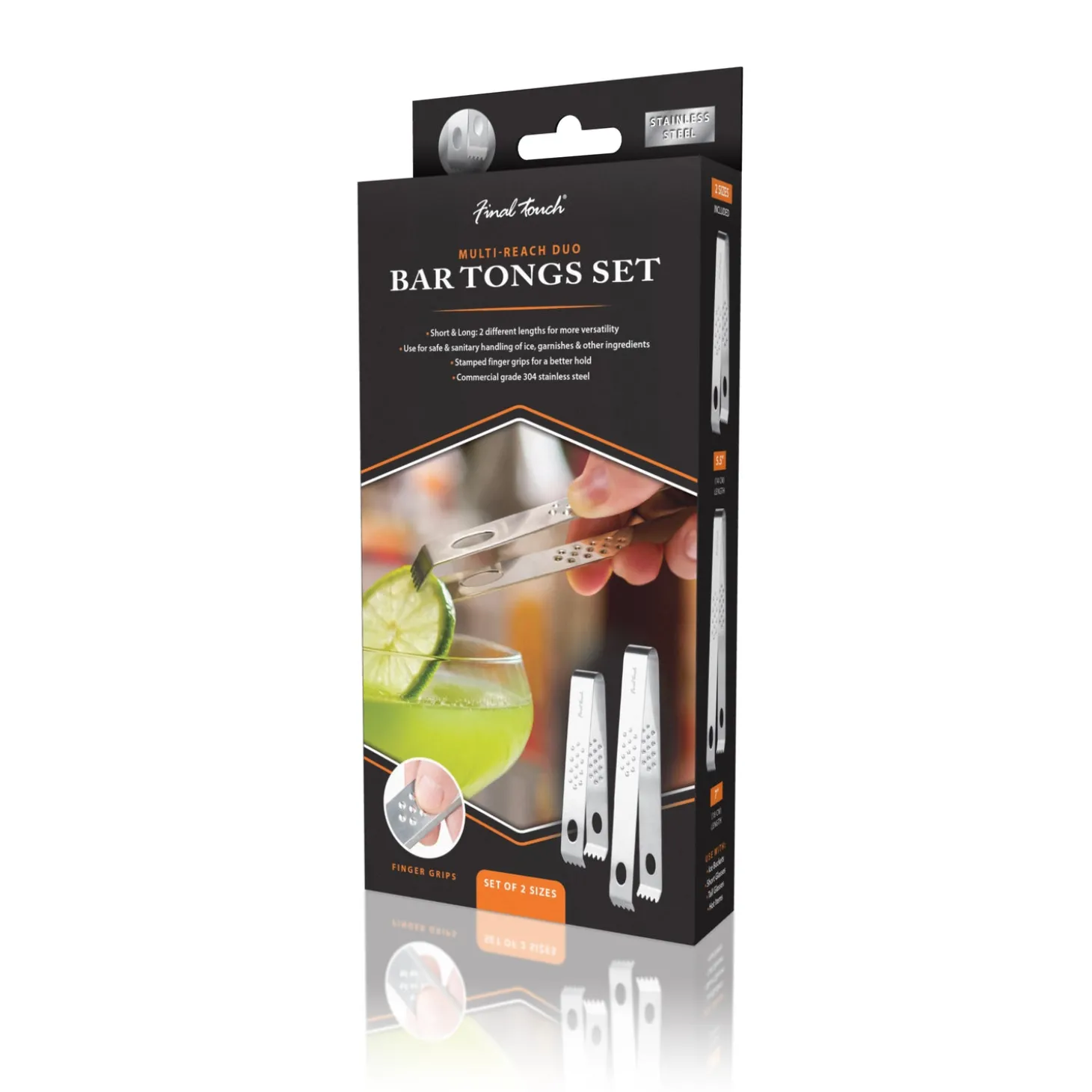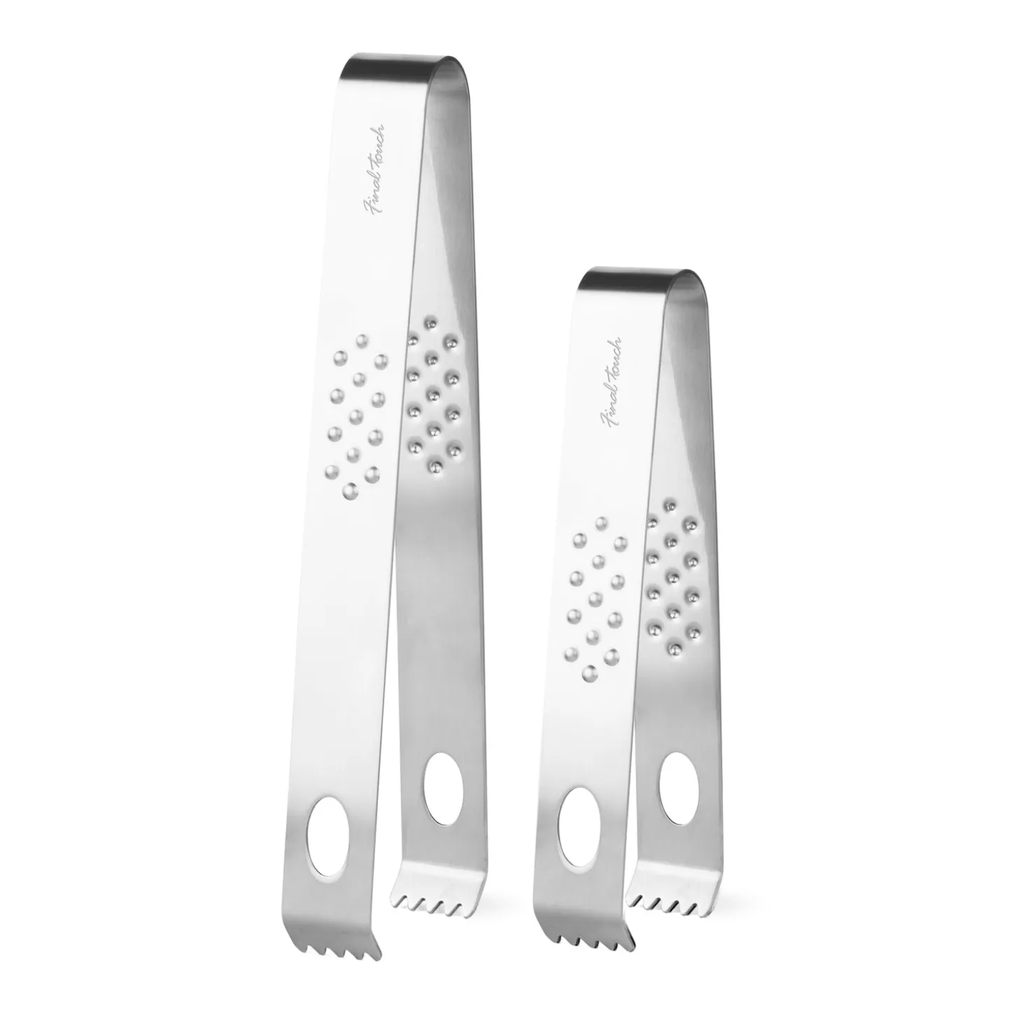 These bar tongs are perfect for handling ice, garnishes or other ingredients used for cocktail preparation. Used by bartenders to provide precise control while picking up ice or garnishes such as mint leaves, olives or cherries. This set includes two sizes of tongs that provide additional versatility for short or tall glassware and ice buckets.